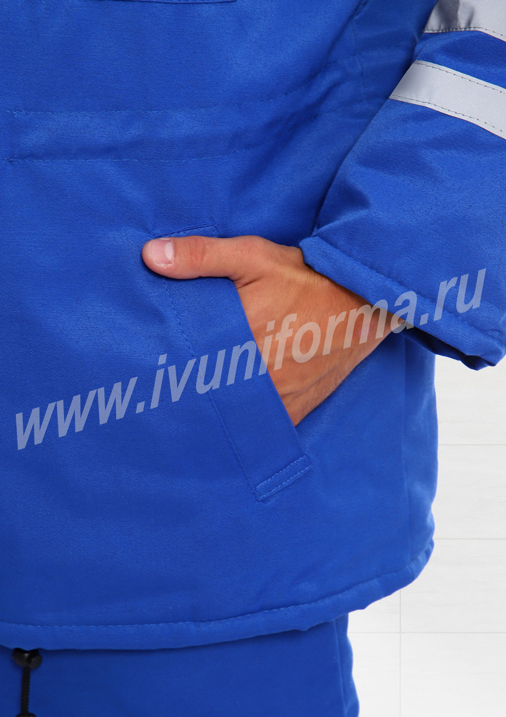 Костюм мужской для скорой помощи состоит из куртки и брюк. Куртка средней длины с воротником стойкой, с центральной застежкой на молнию и ветрозащитной планкой на кнопки. Для регулировки объёма куртка имеет кулису на уровне талии. На куртке два фигурных нагрудных кармана с клапаном на кнопке и два нижних прорезных кармана. На передней части, спинке и рукавах светоотражающие ленты. Утепление куртки 450 гр/кв.м.