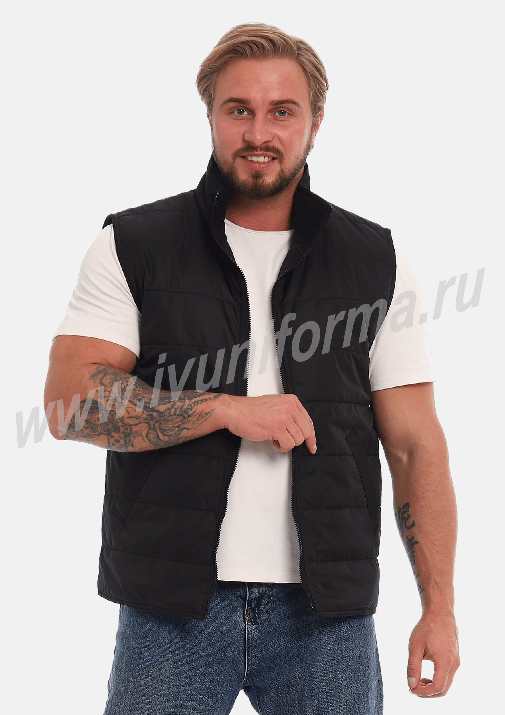 Жилет утепленный на молнии с двумя боковыми карманами в нижней части. Внутренняя часть жилета выполнена из ткани флис. В качестве утеплителя используется синтепон. Жилет является универсальным для использования как мужчинам, так и женщинам.
