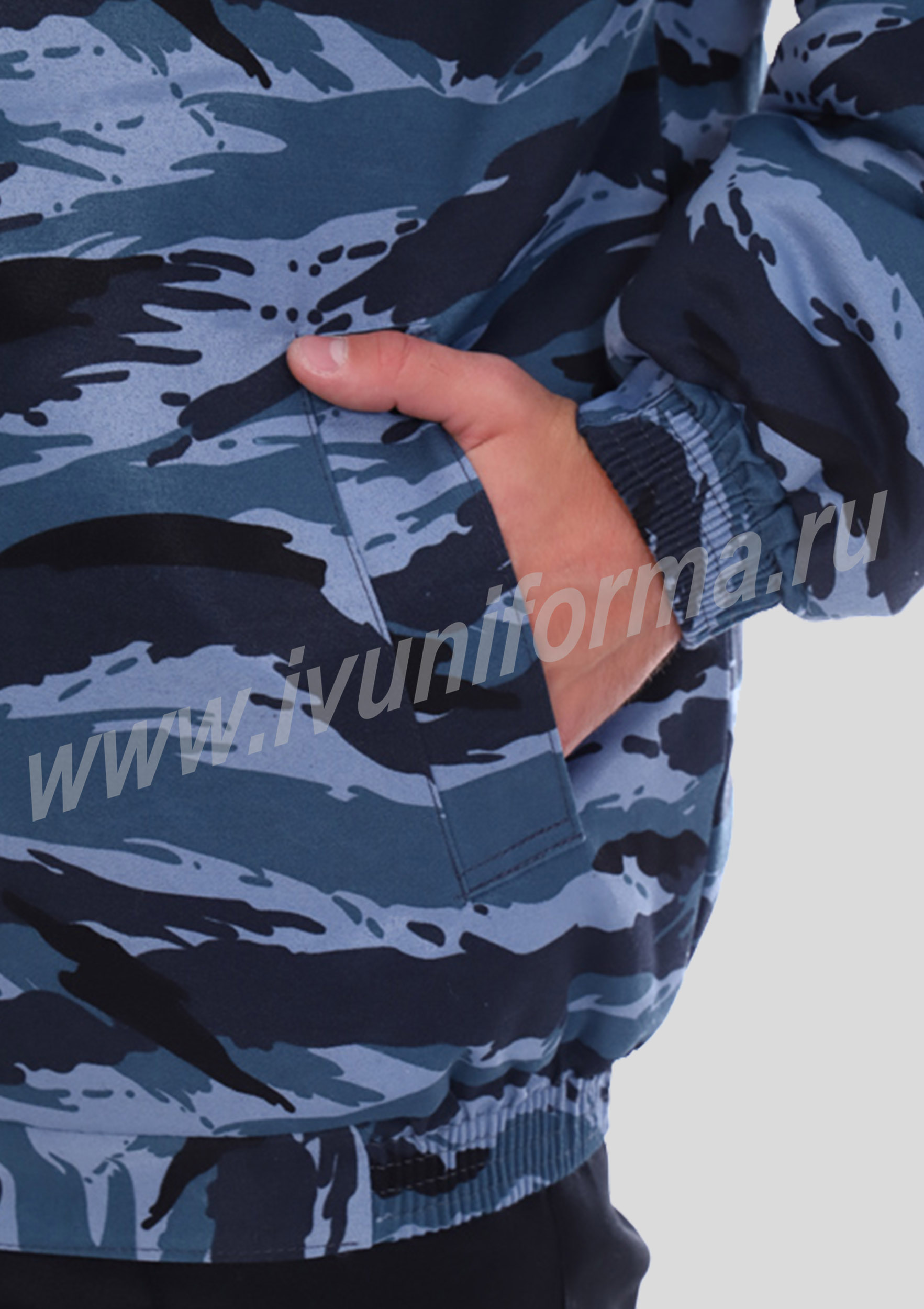 Куртка рабочая мужская для охранника, укороченная, с капюшоном на разъемной молнии, закрытой ветрозащитной планкой на кнопках. На полочке один нагрудный прорезной карман на молнии, нижние карманы прорезные с листочками. Один внутренний карман на молнии. Рукава с притачными манжетами. Воротник - стойка. Капюшон съемный с регулировкой по объему. Куртка предназначена как для повседневной носки на предприятиях так и для сотрудников охранных структур.